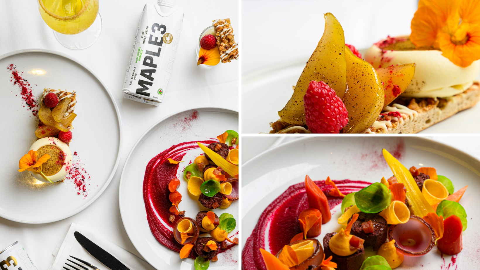 Cette année, le restaurant La Fenouillière s’associe à Maple 3 pour un menu raffiné, mettant à l’honneur leurs délicieuses eaux d’érable pétillantes. Découvrez un apéritif French 75 revisité à l’eau d’érable Maple 3, ainsi qu’une mousse d’eau d’érable et chocolat blanc, accompagnée d’une poire pochée au sirop et d’un financier aux noix de Grenoble.
